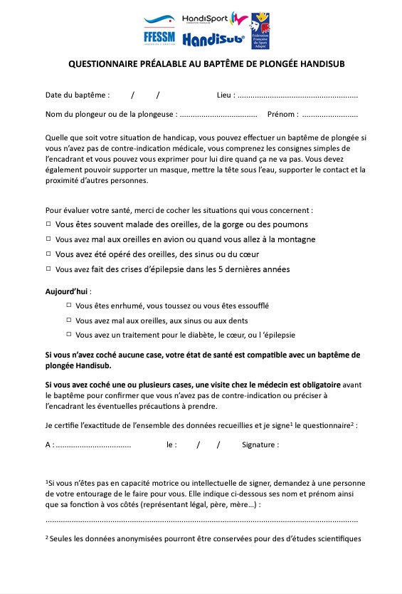 Vous êtes en situation de handicap et vous souhaitez faire un baptême de plongée avec nous, merci de télécharger ce questionnaire (lien) qui vous orientera sur le besoin ou non de consulter un médecin au préalable.